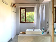 Inside, cool kota stone floors, white walls, a mix of custom furniture, vintage picks and featured artwork, a high sloping insulated roof and natural light throughout adds warmth and comfort. The rear length of the studio rooms have slatted teak windows over looking the forest and above an entire row of clear skylights that look to the trees and stars and night. The kitchen has modern cabinets and appliances with refrigerator and microwave. The bathroom has a large walk in closet area, large clear and slatted windows with terrific views.